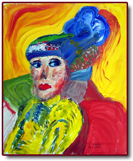 Lady Maskenherz Ihr Blick ist tapfer und stolz. Und dennoch lässt Sie Ihre Berührbarkeit des Herzens trauern - trotz all der Stärke steht Sie dem Leid der Welt hilflos gegenüber.Vermag Ihre Hoffnung die Farben genug zum Leuchten zu bringen, um andere Menschen zu inspirieren? - Sie glaubt daran... Acryl auf Leinwand, 2002, 50cm x 40cm Interesse am Bild? Mailen Sie mir: friedasfratzen@gmx.de |